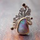 This ring was my favorite from the first minute I saw it. The beautiful flash of colors in the stone, the dramatic and delicate composition of the gold and silver ginkgo leaves, the accent rubies that complement the opal perfectly... It is honestly one of the most amazing pieces of jewelry I have ever seen. It just blows my mind!